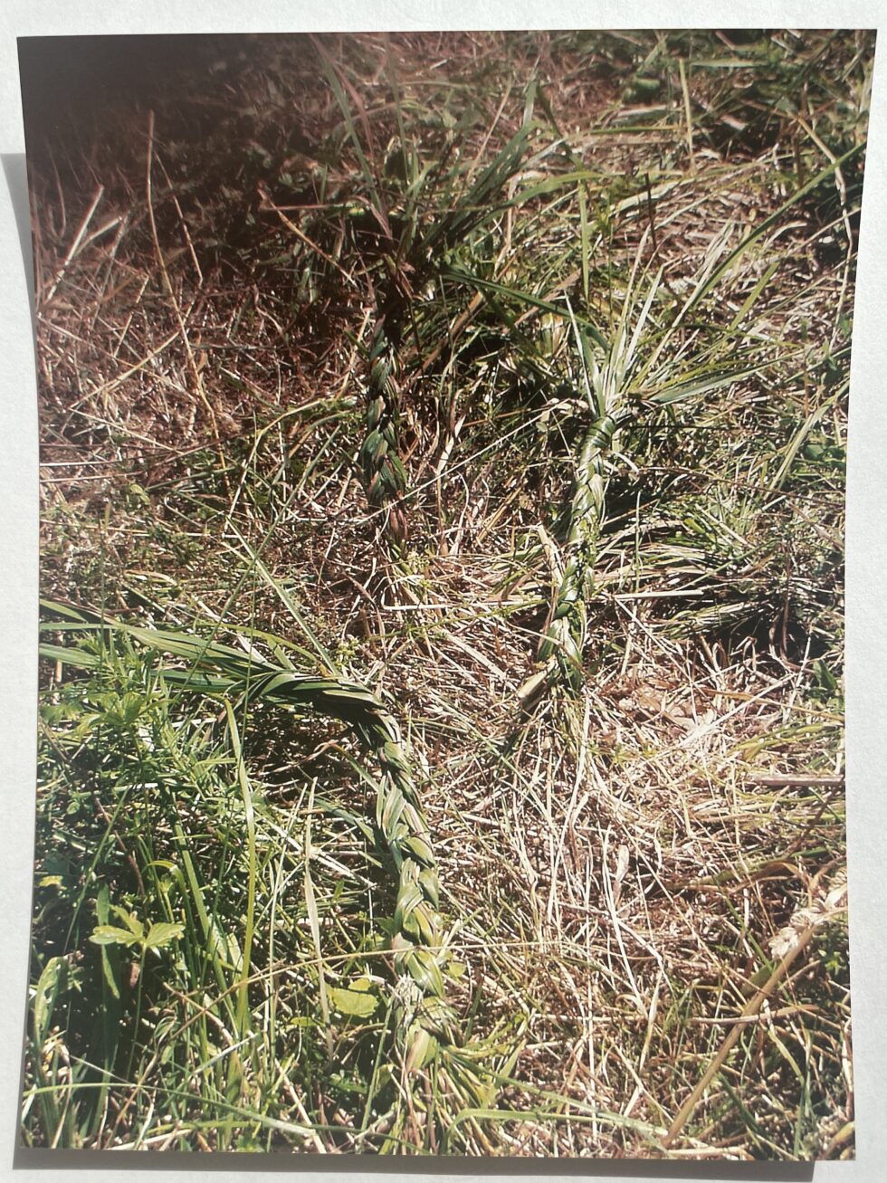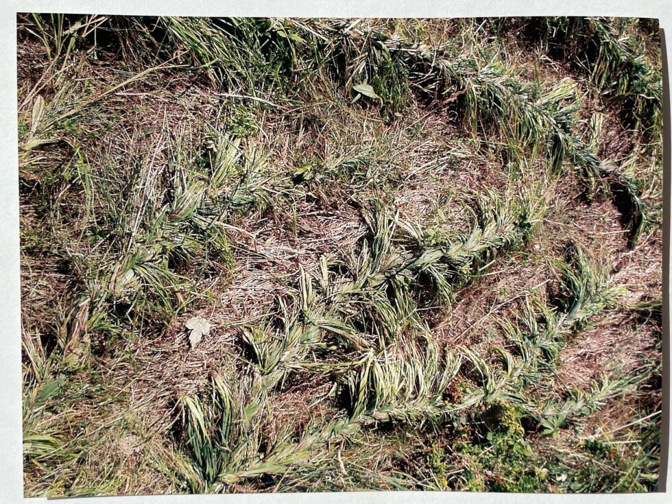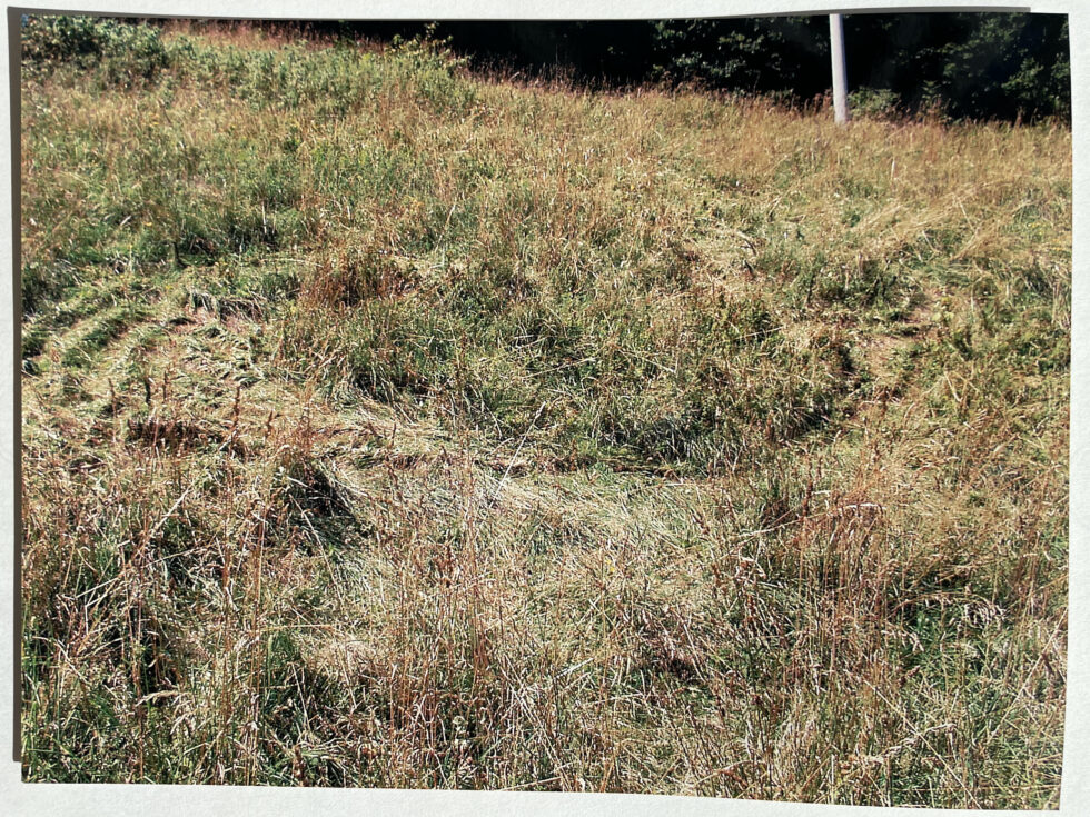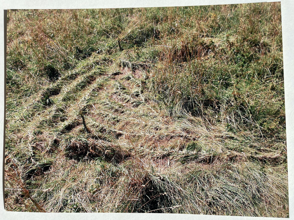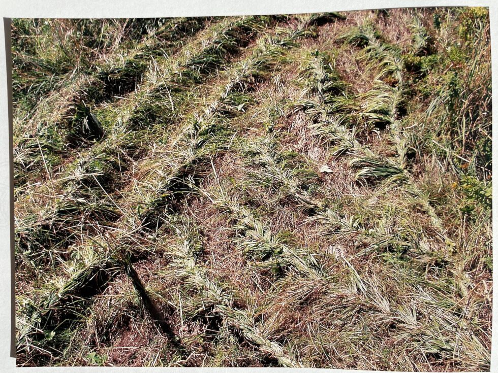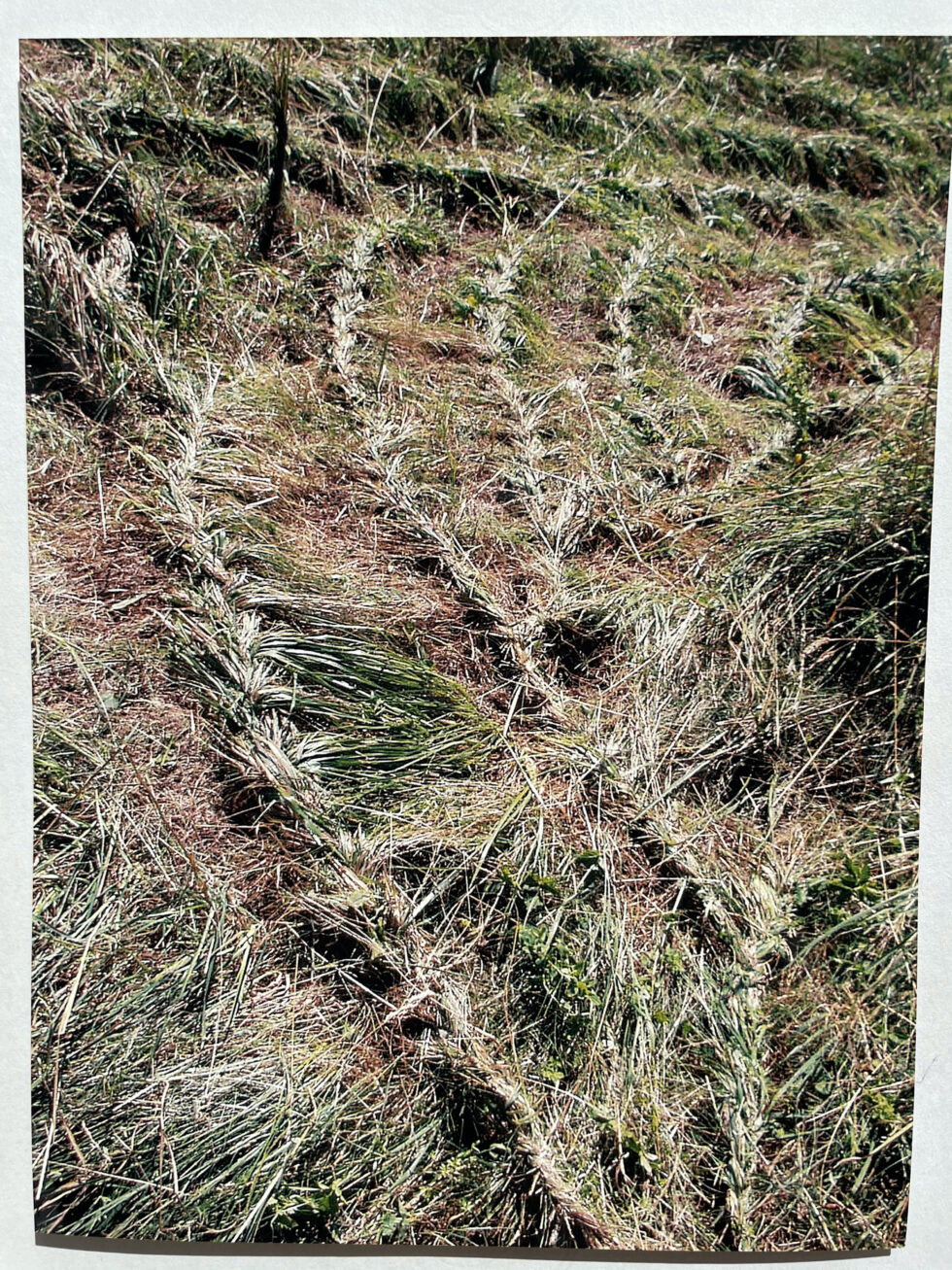 “The object of my interest in this case was the confrontation with high, maturely grown grass in the village of Lokovec, Slovenia. I decided to attack the hill by plaiting the grass in several braids along the slope. The summer heat was blazing, there was no shelter from the sun and the hill was rather steep. Still, after a day, the grass in a small area was conquered, the braids were convincingly shaped.