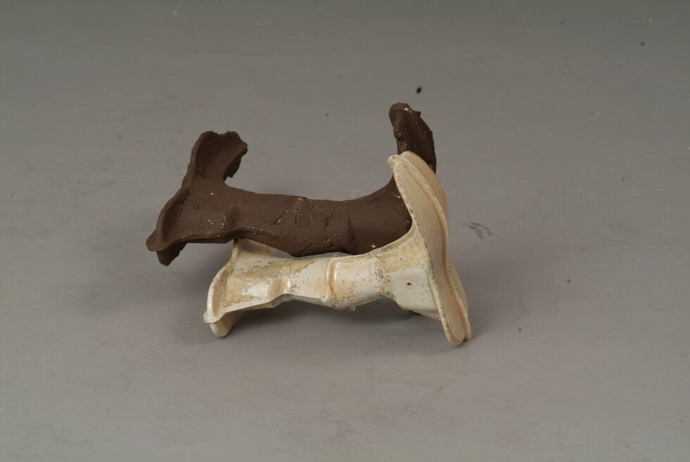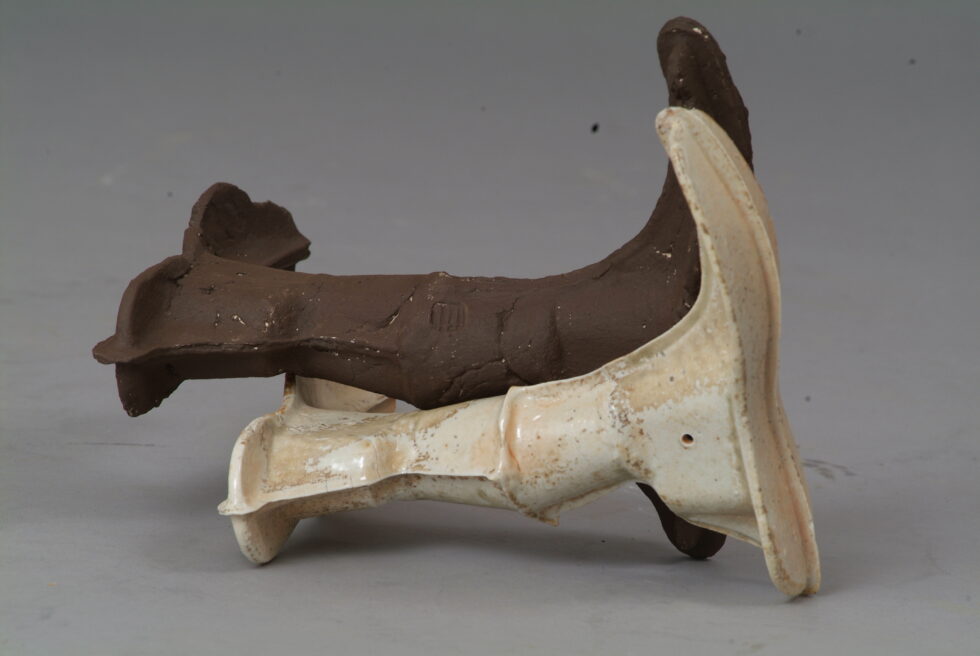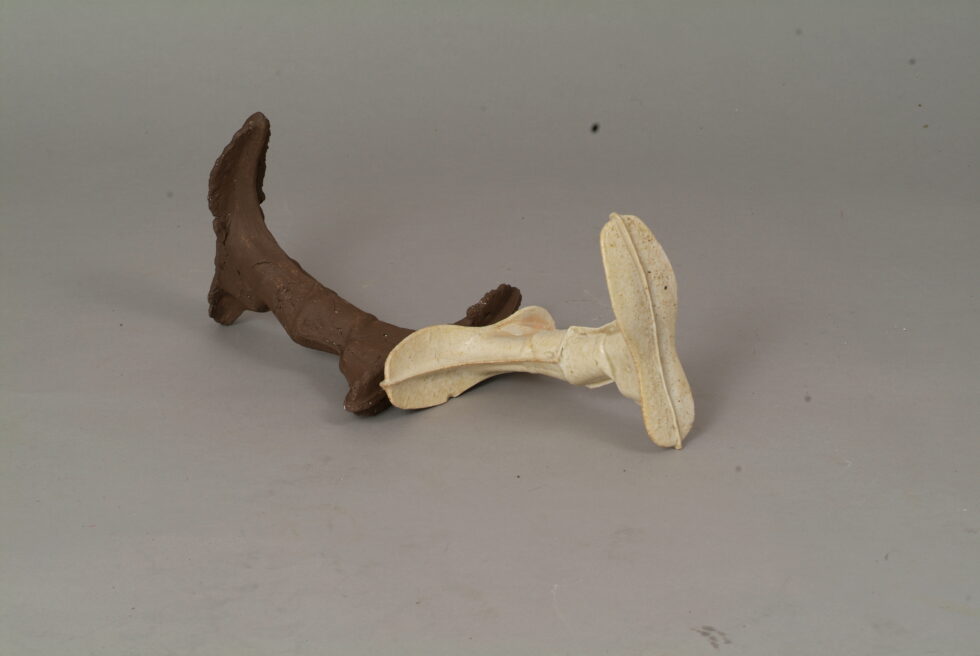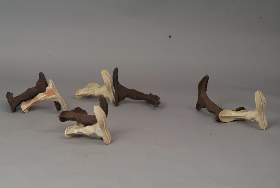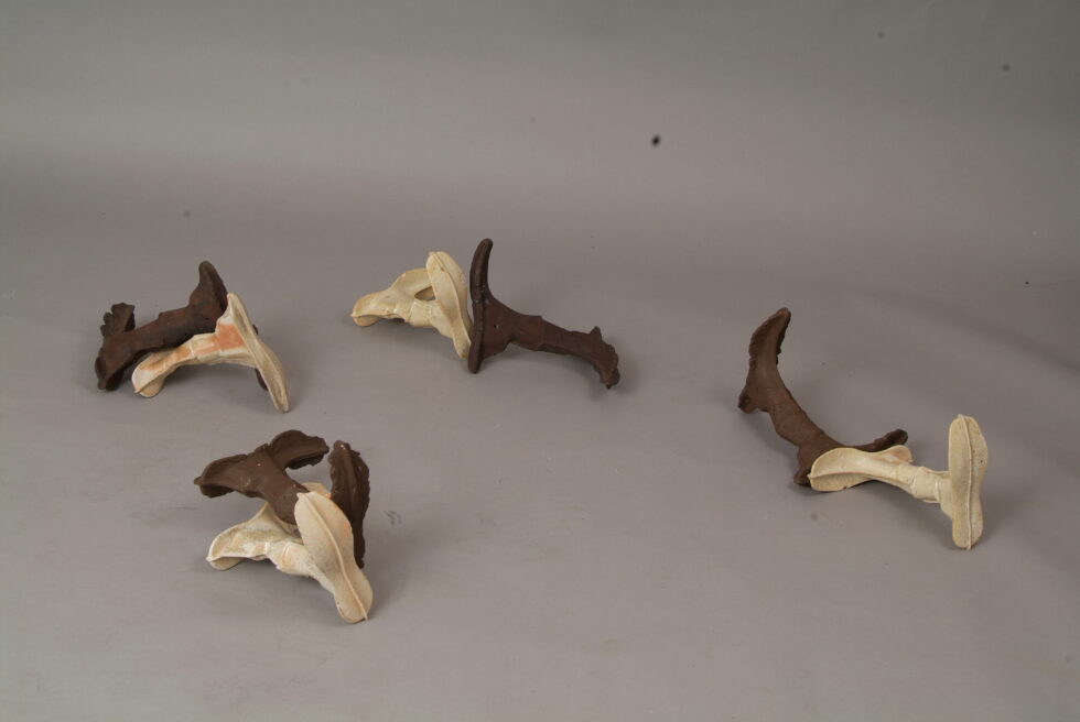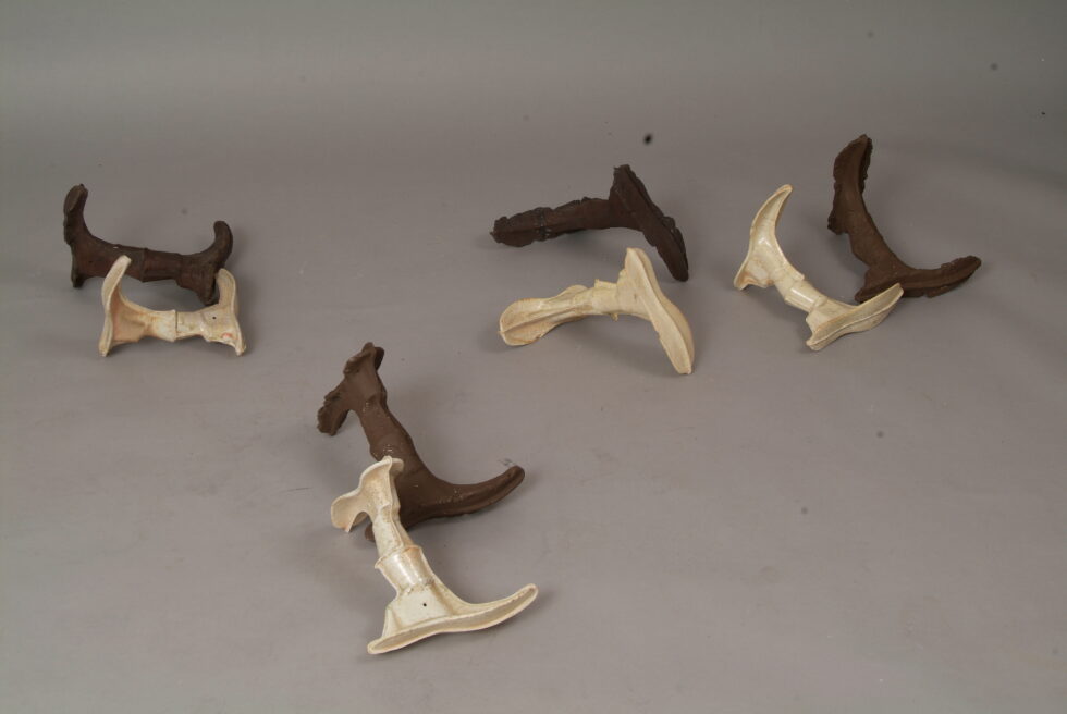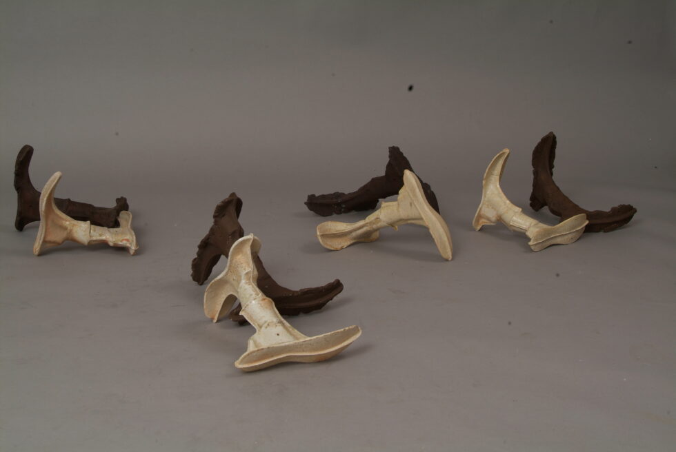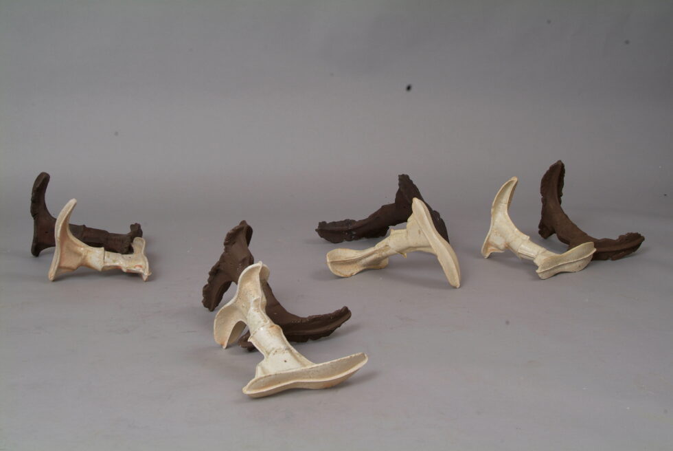 “The entire cycle is based on the use of a single mold made with a shoemaking last, the word for which in Slovene also means that all elements are identical. From this starting point I began an interpretation of individual elements in a set and the analysis of the relations between them, with different compositions defining different relations. I am taking individual elements in the installation Shadows as human figures and searching for an intimate atmosphere between two abstracted identities.I place the dominant and the subordinate figures into a relationship that enables a confrontation between light and dark, smooth and rugged, gentle and rough, porcelain and clay. In this classical dialectic of form, I am trying to introduce the theme of the subtle relations between different phenomena.”