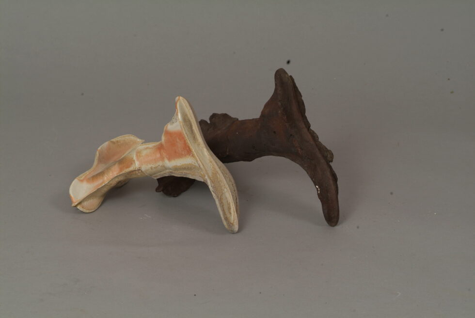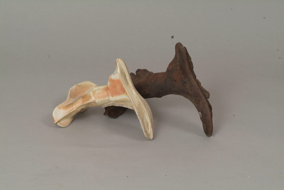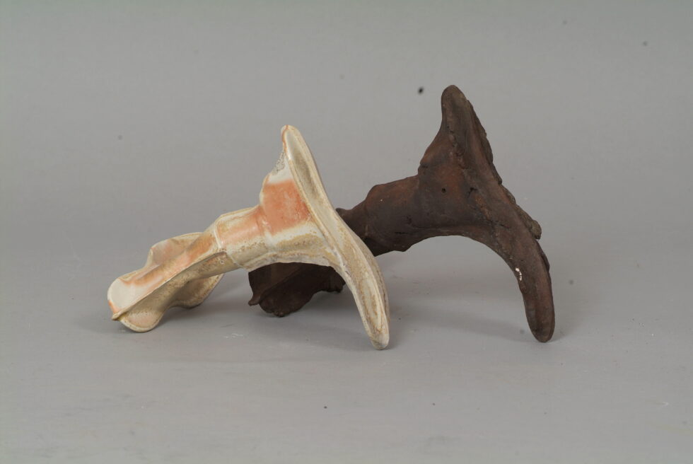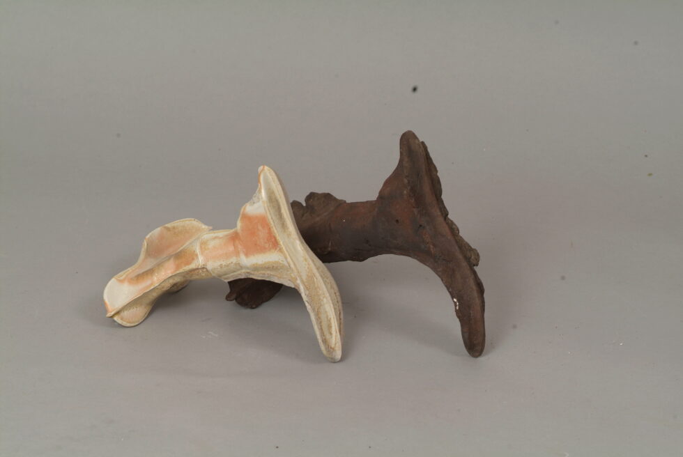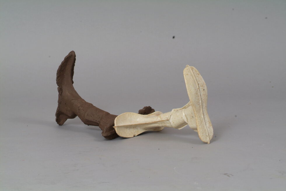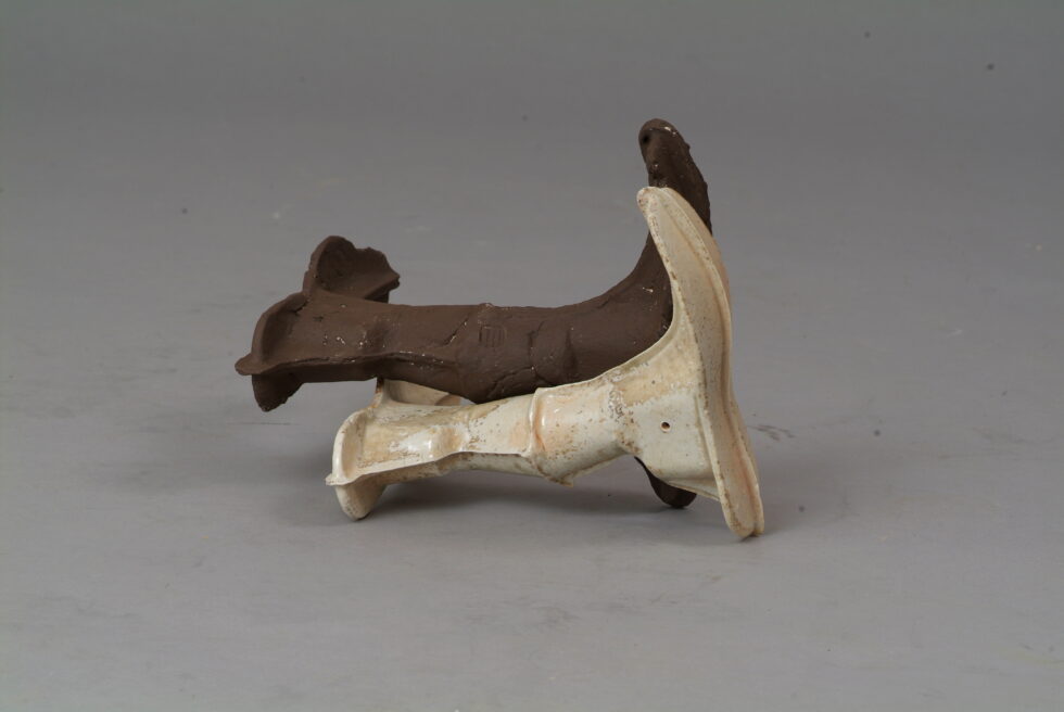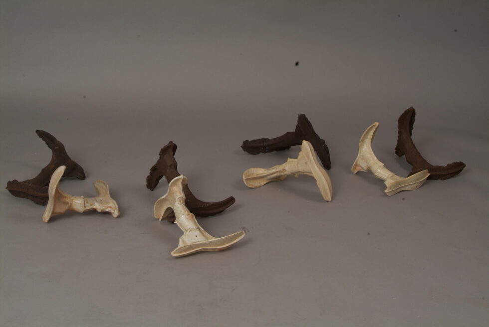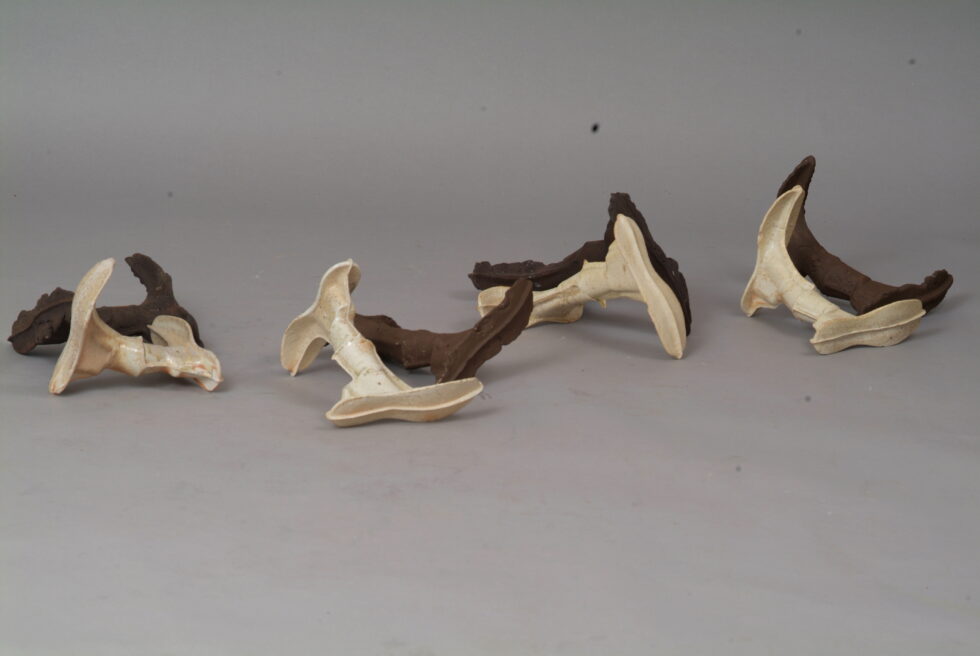 “The entire cycle is based on the use of a single mold made with a shoemaking last, the word for which in Slovene also means that all elements are identical. From this starting point I began an interpretation of individual elements in a set and the analysis of the relations between them, with different compositions defining different relations. I am taking individual elements in the installation Shadows as human figures and searching for an intimate atmosphere between two abstracted identities.I place the dominant and the subordinate figures into a relationship that enables a confrontation between light and dark, smooth and rugged, gentle and rough, porcelain and clay. In this classical dialectic of form, I am trying to introduce the theme of the subtle relations between different phenomena.”