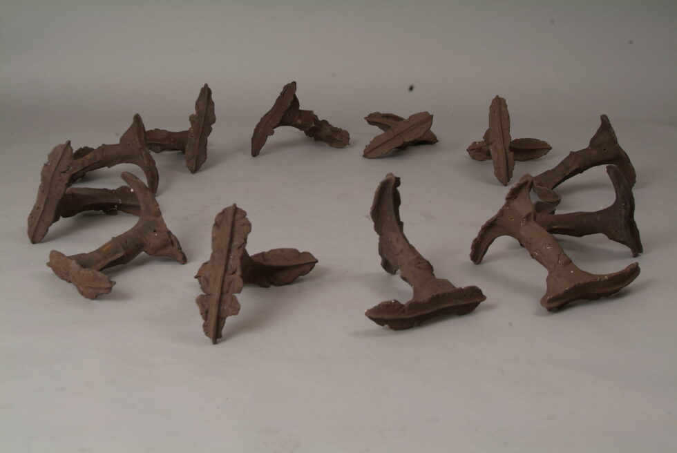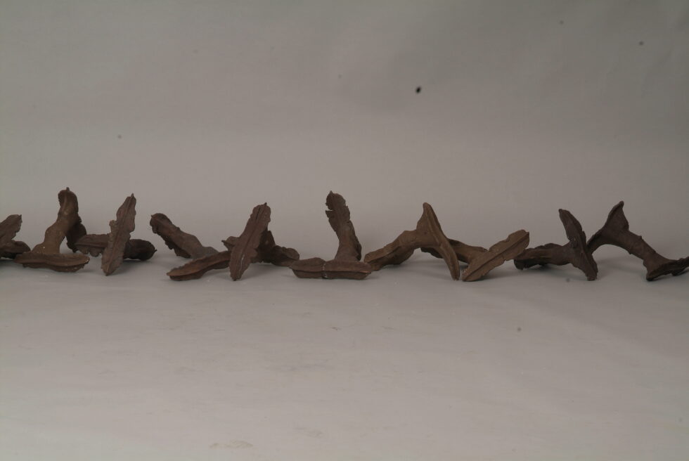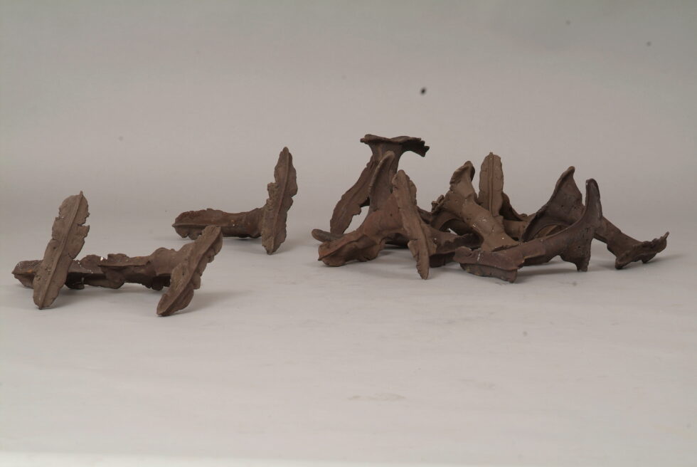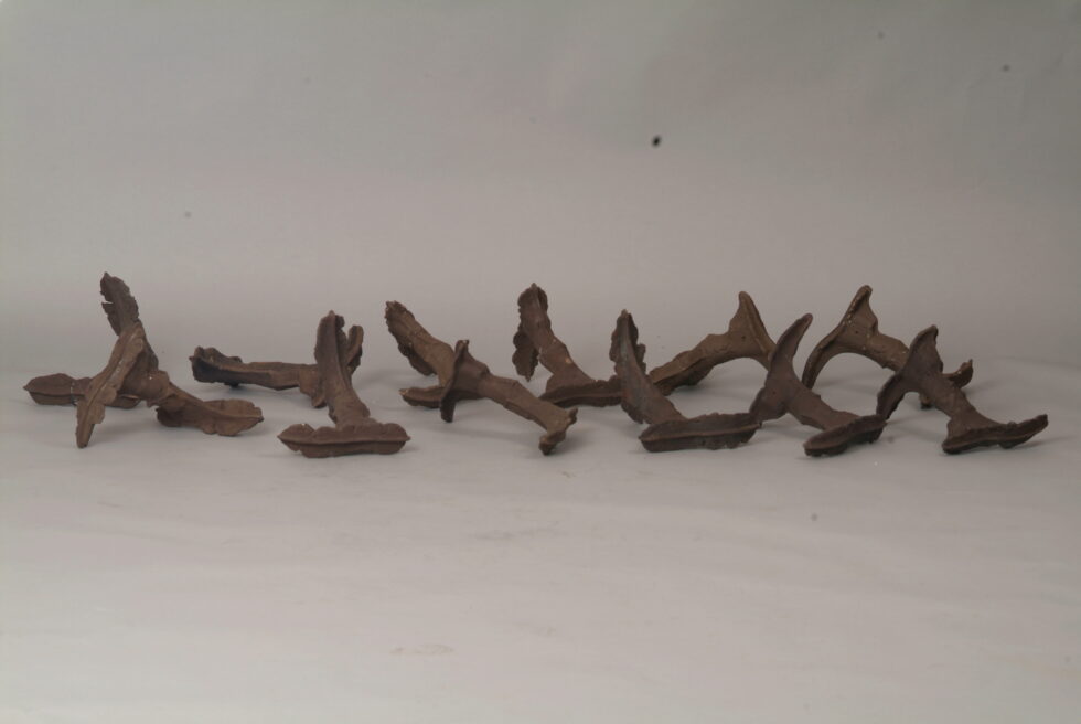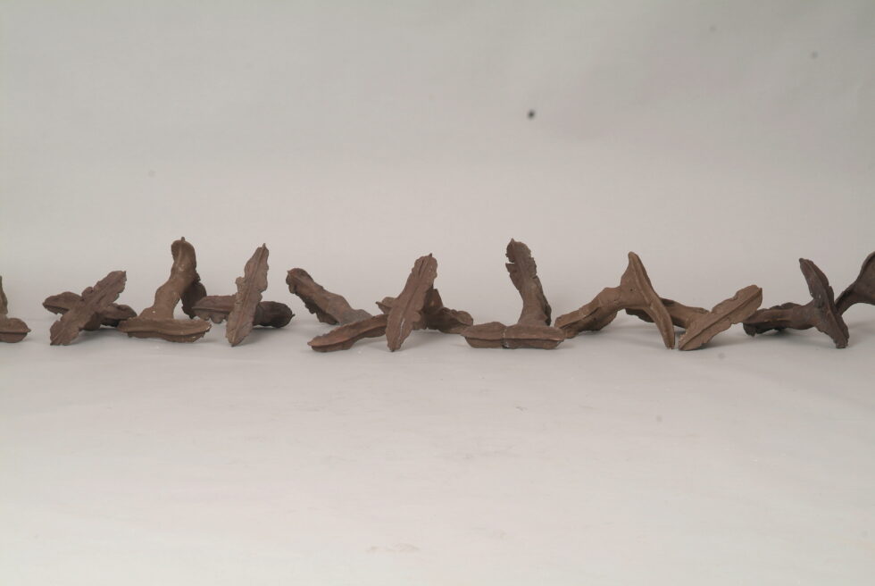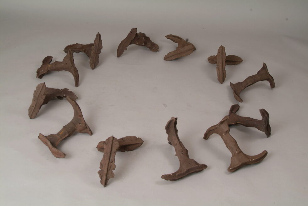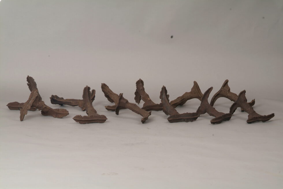 “This piece demands the viewer to imagine the individualcomponenets in movement. Each part is made up of two pieces which can be reminiscent of a foot wearing a boot or a part of a turbine – a mechanical part. The rusty look of the parts seems antiproductive to the implied movement. The parts are not connected into larger wholes and they may be positioned in a variety of ways as long as the approximate distance is such that the eye sees them as a whole. The objects, conceived as anonymous individuals or pairs, bring up questions on humanity, free will and the identity of 21st century individuals.”