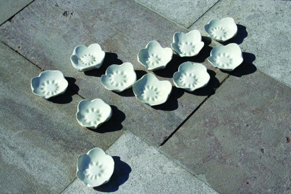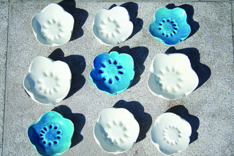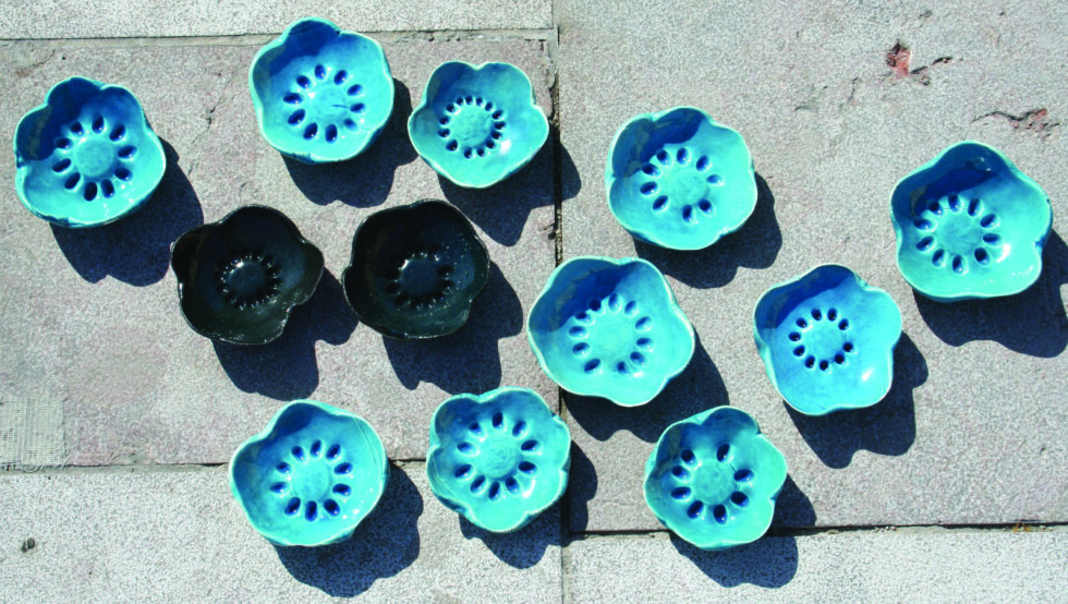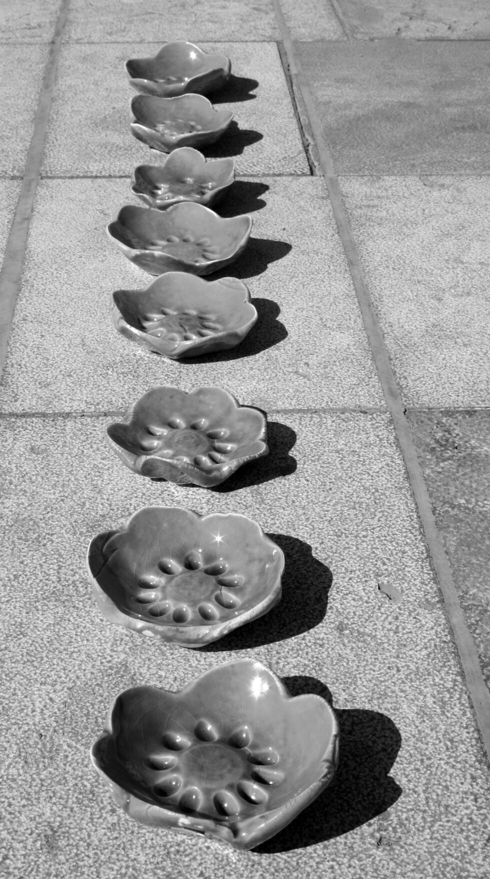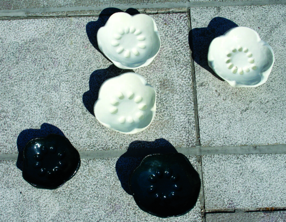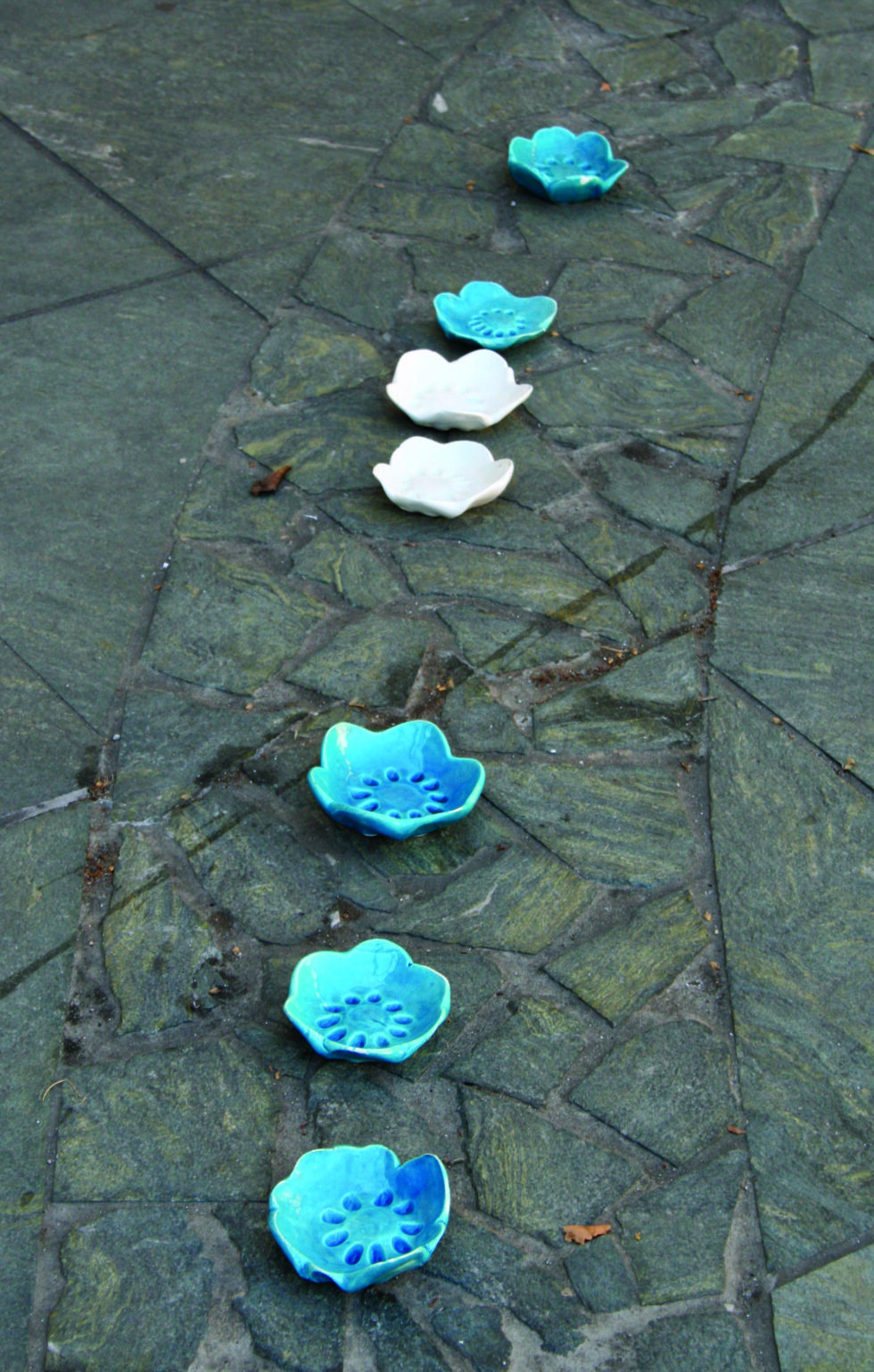 The blossoms are bowllike so they can be perfectly used as ceramic pots for offering food. The technique of shaping them makes each of them a unique bowl while together they play a merry family.”