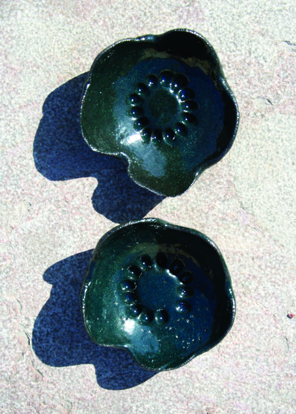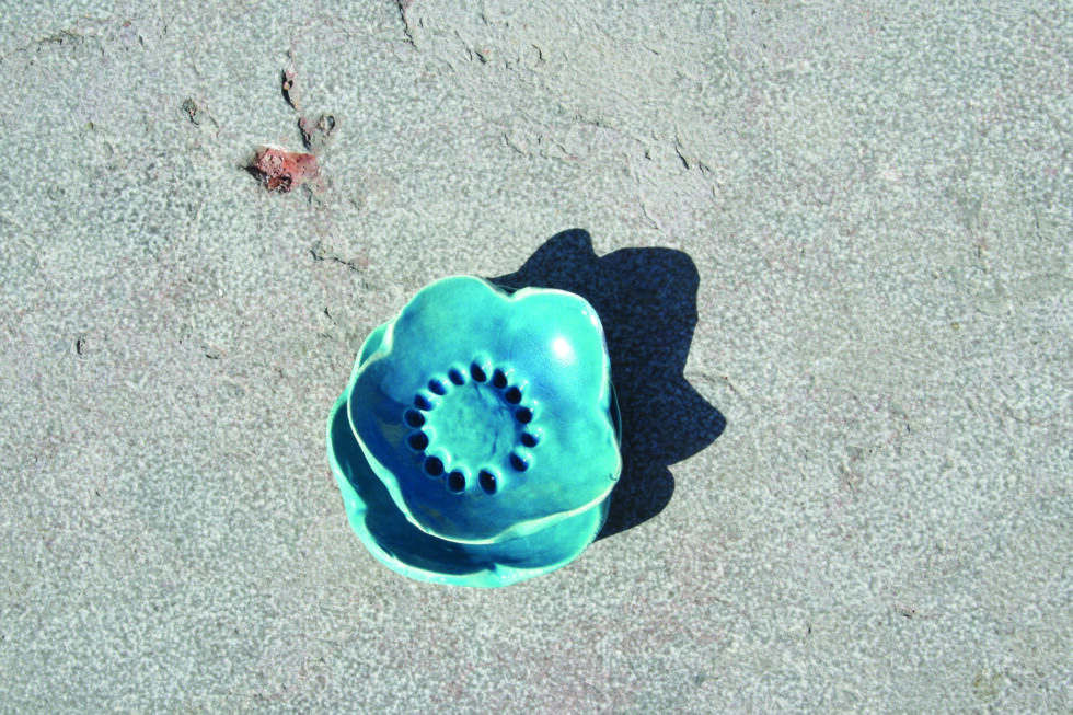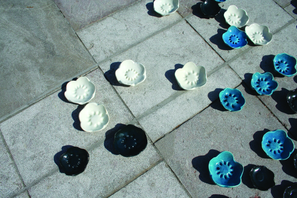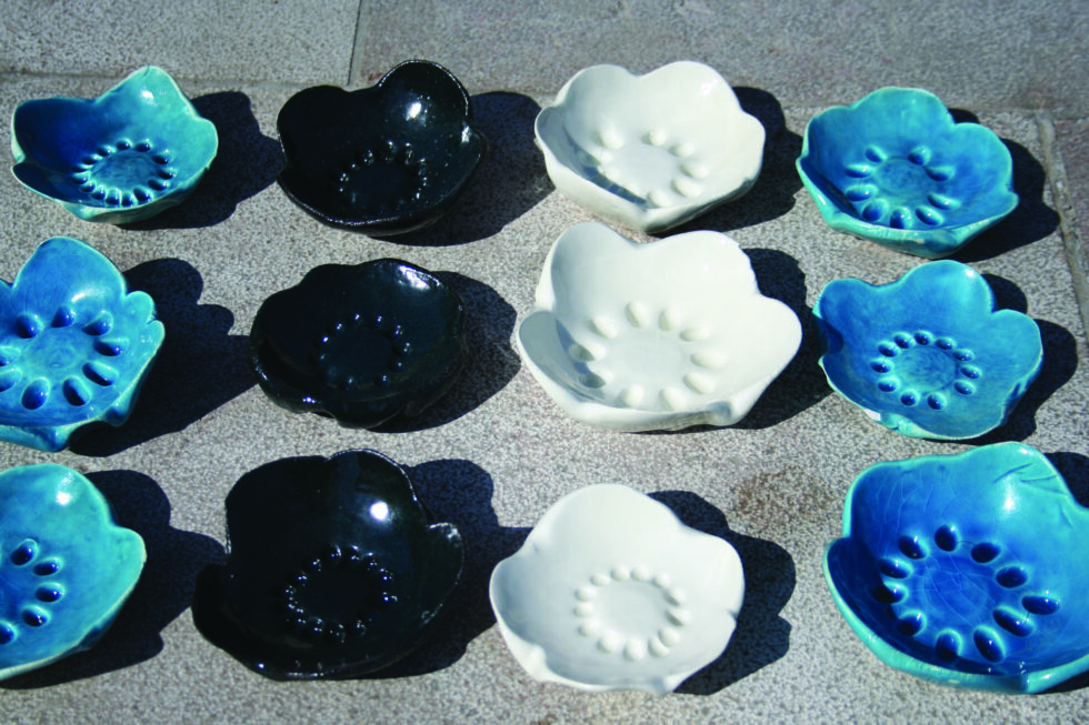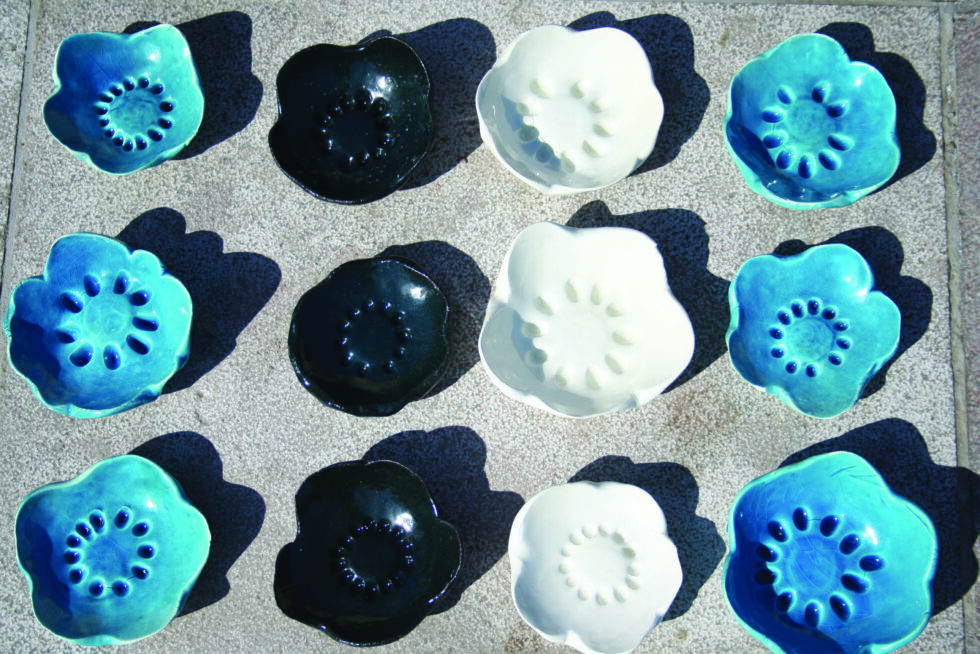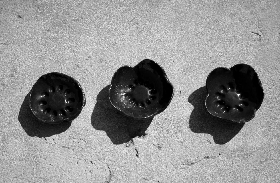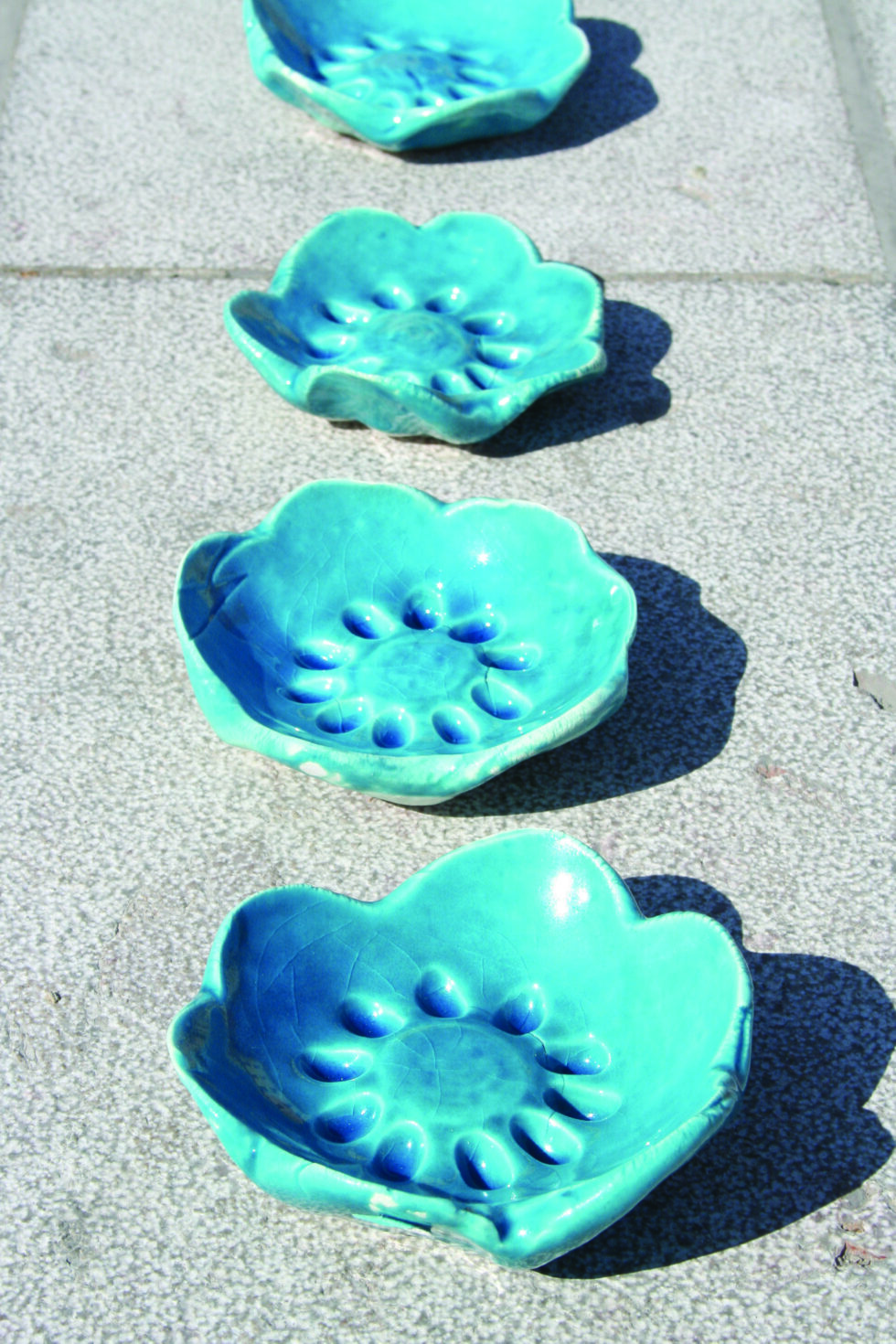 The blossoms are bowllike so they can be perfectly used as ceramic pots for offering food. The technique of shaping them makes each of them a unique bowl while together they play a merry family.”