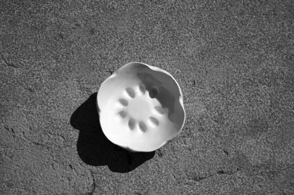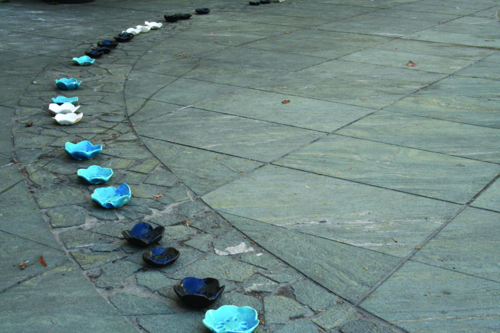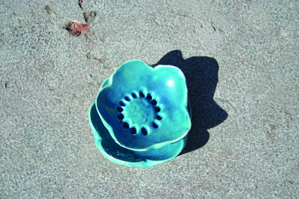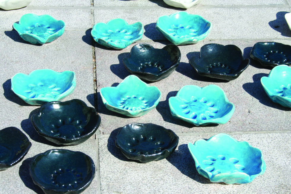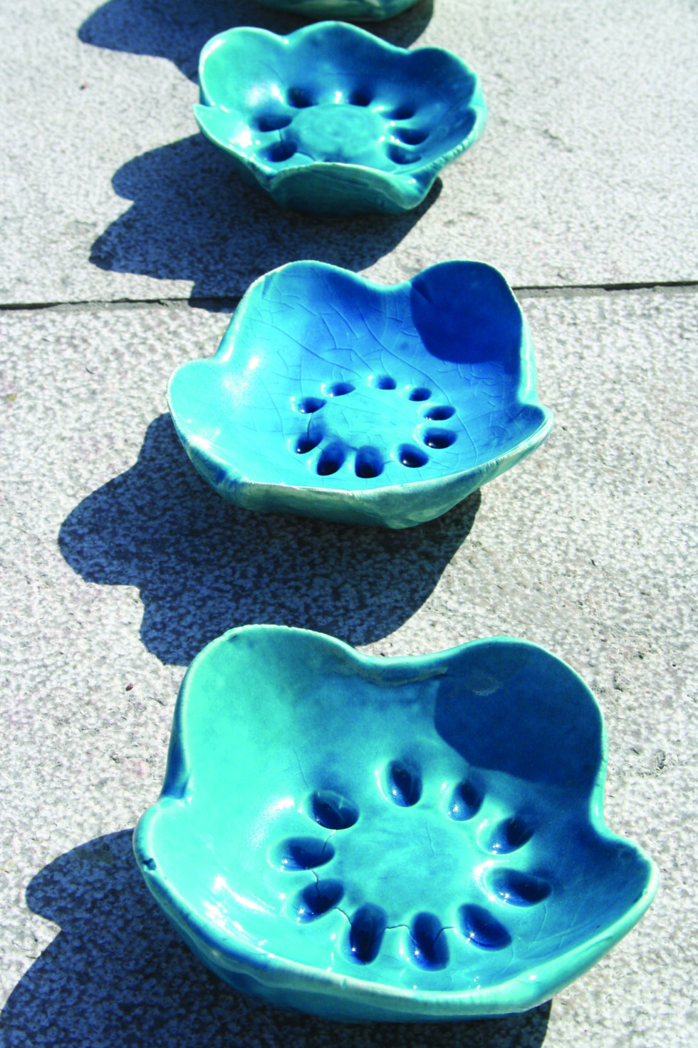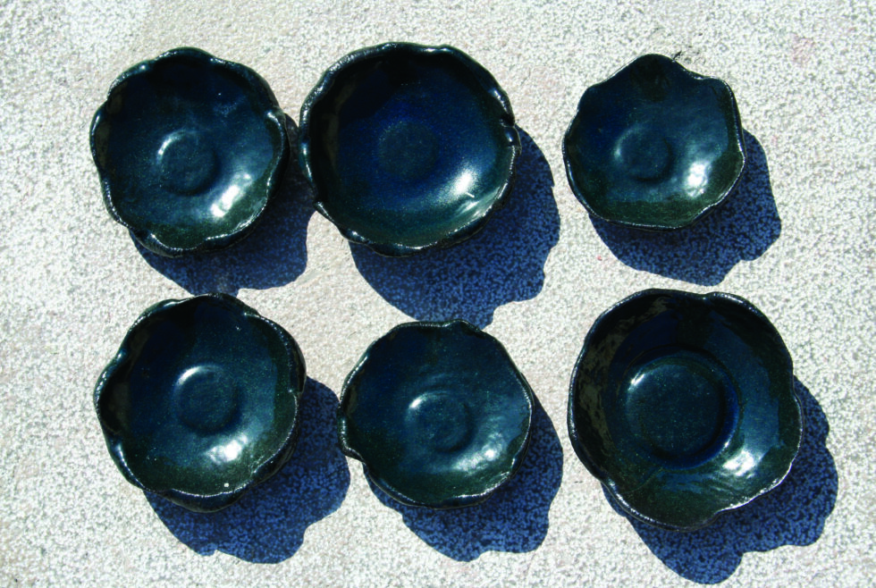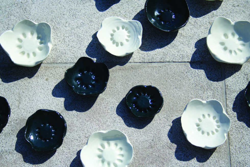 The blossoms are bowllike so they can be perfectly used as ceramic pots for offering food. The technique of shaping them makes each of them a unique bowl while together they play a merry family.”