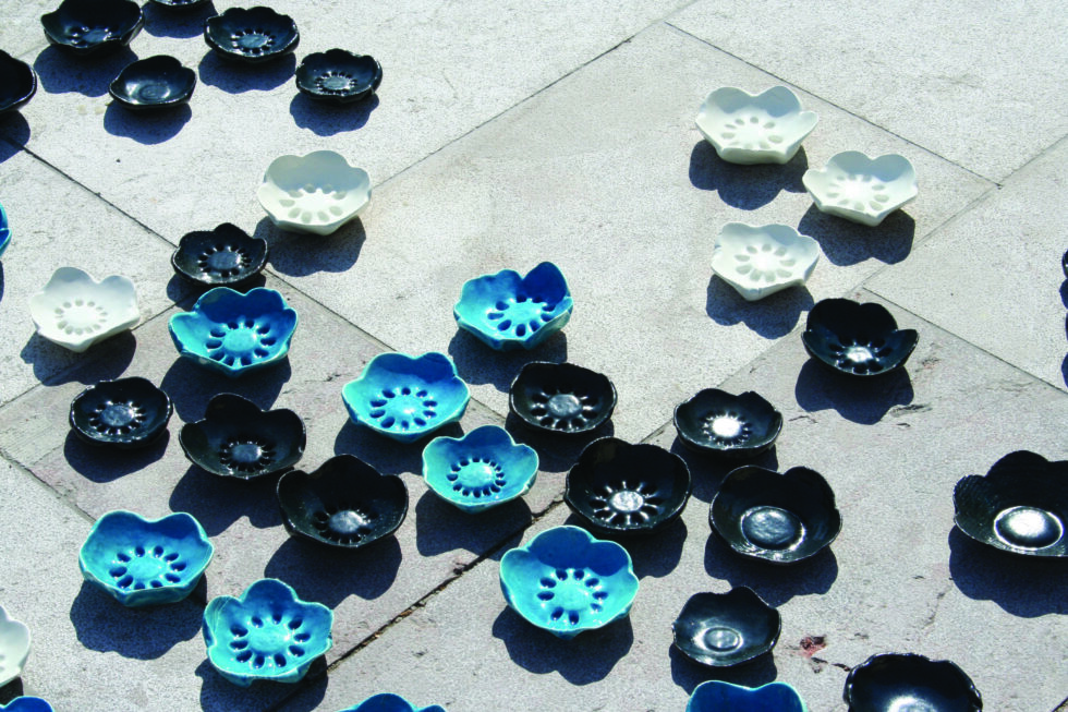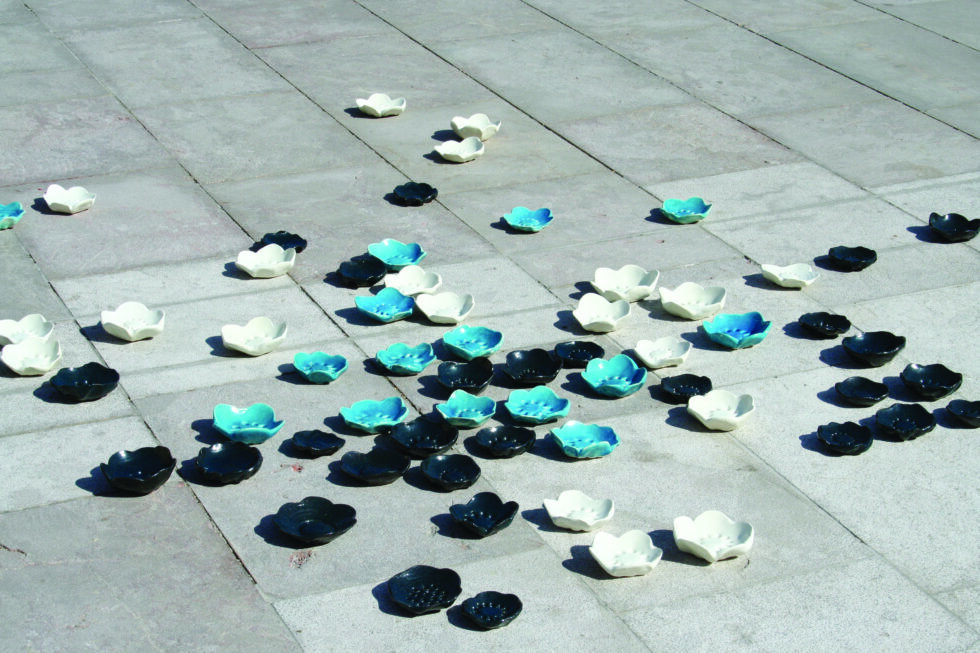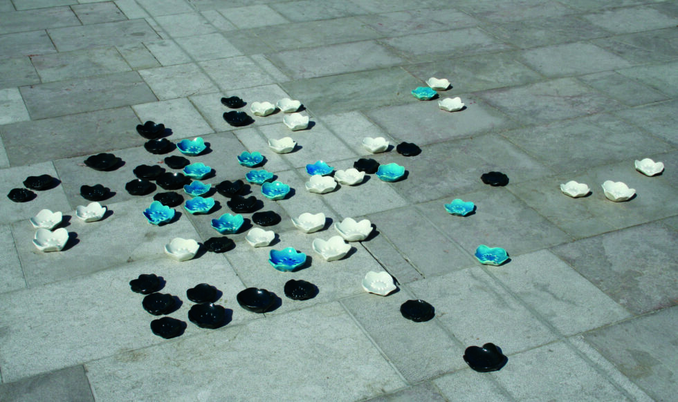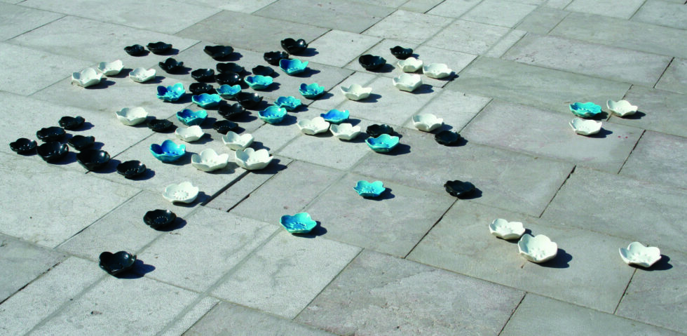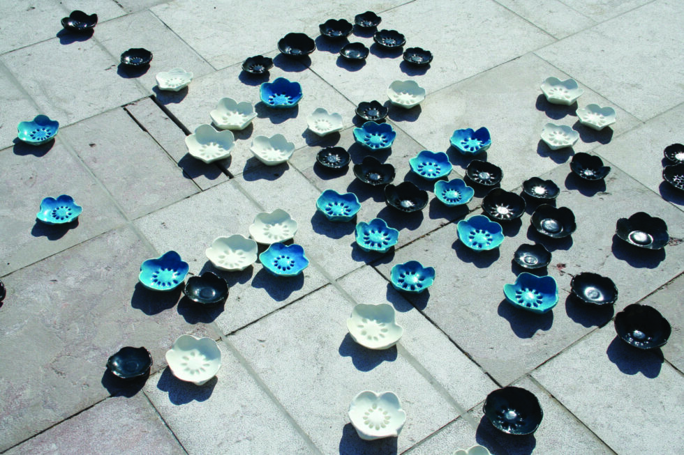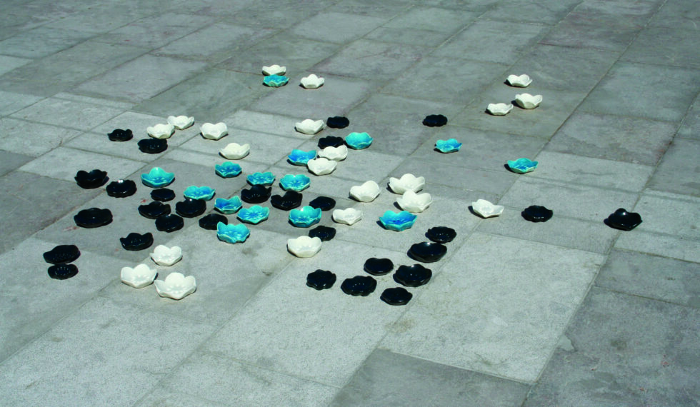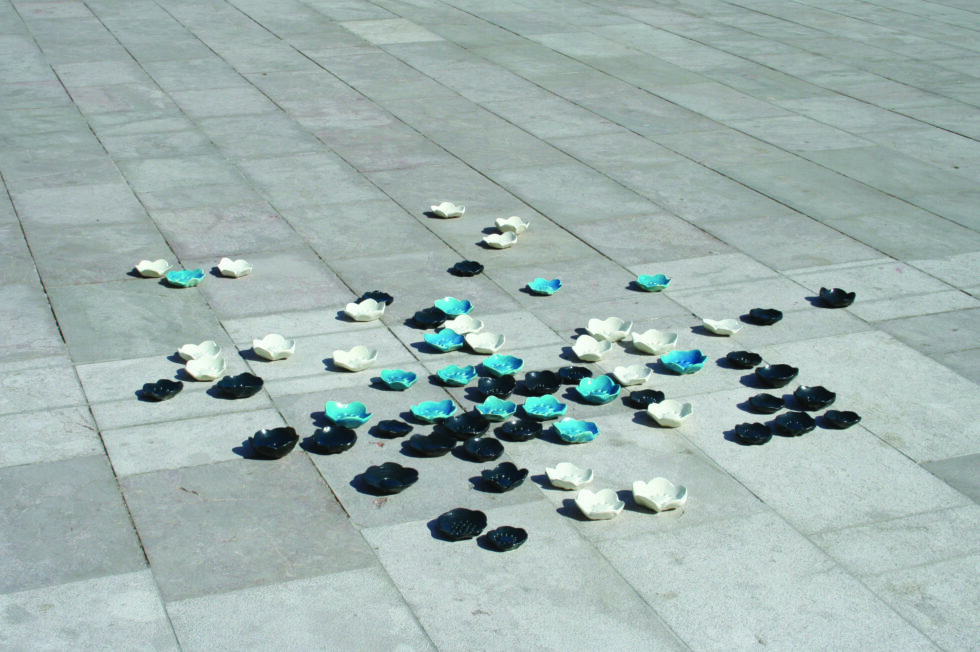 “While creating each of the objects in „The Blossoms“ I had in mind the softness and pliability of the clay material. I developed a technique of rhythmical pounding on clay with the intention of making blossom-like shapes, also suggesting movement. In such a way each of the „blossoms“ is frozen in time.