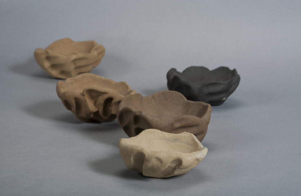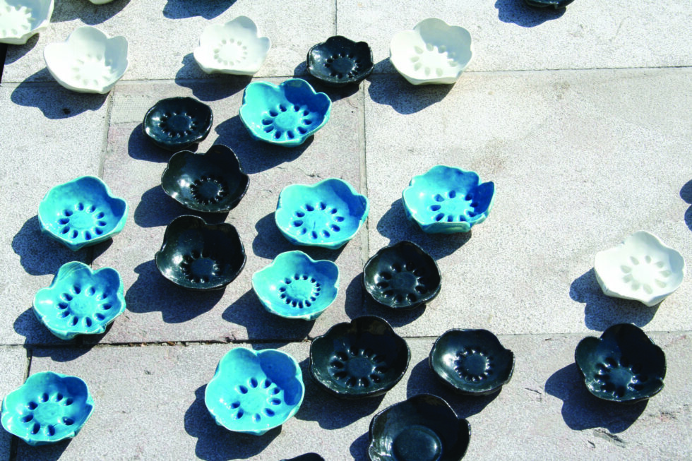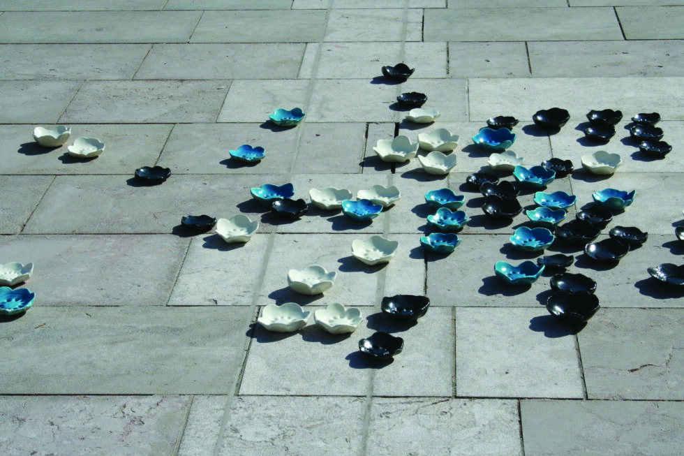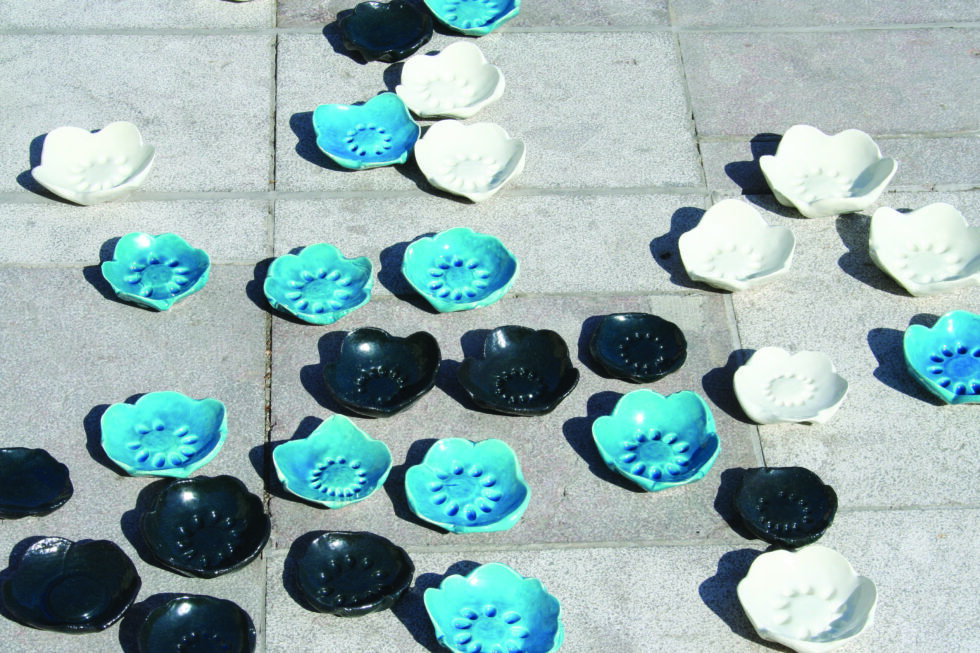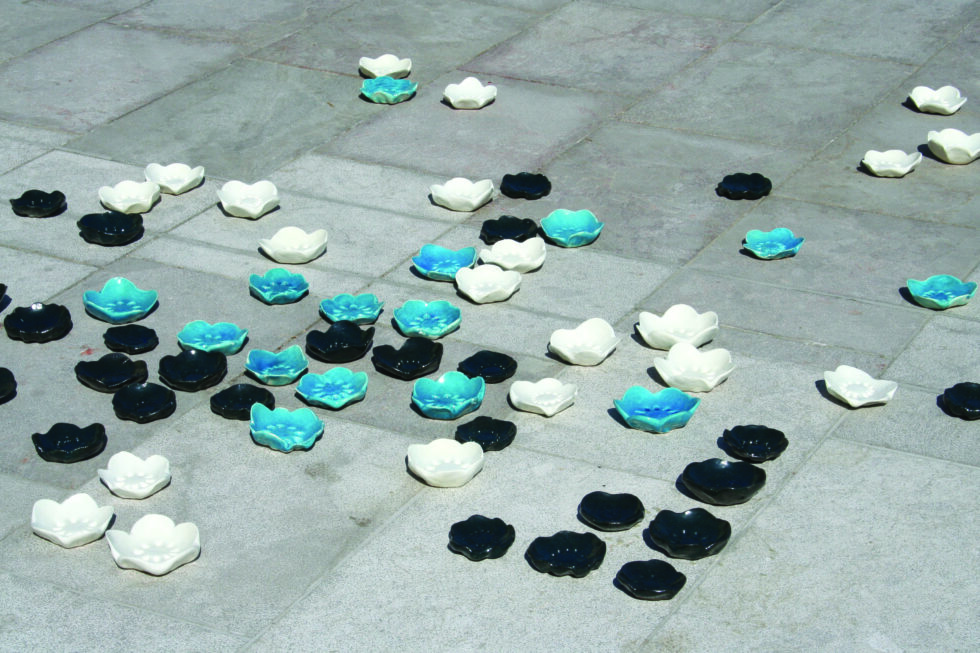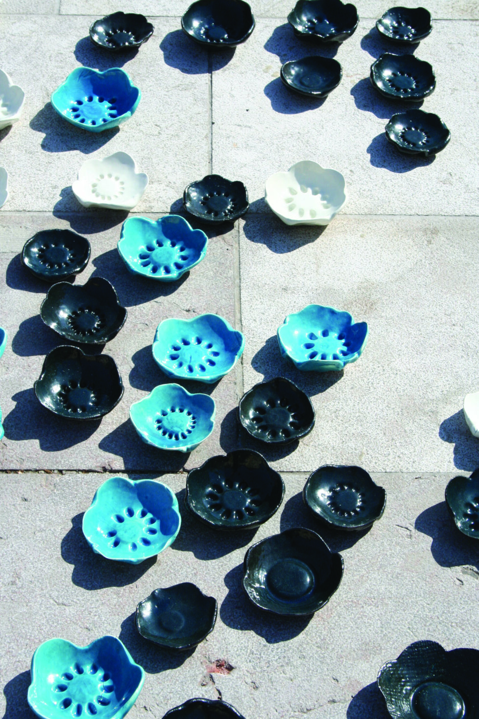 “While creating each of the objects in „The Blossoms“ I had in mind the softness and pliability of the clay material. I developed a technique of rhythmical pounding on clay with the intention of making blossom-like shapes, also suggesting movement. In such a way each of the „blossoms“ is frozen in time.