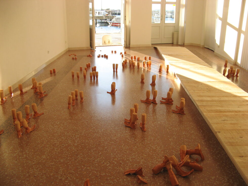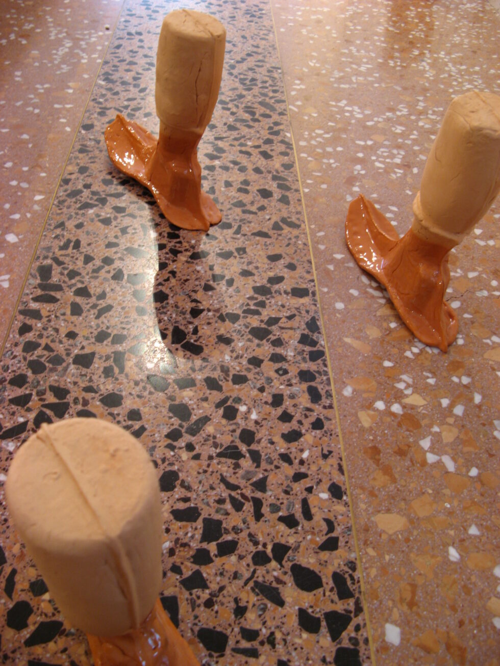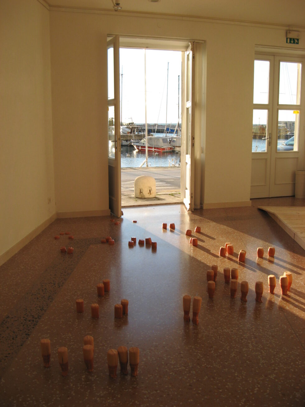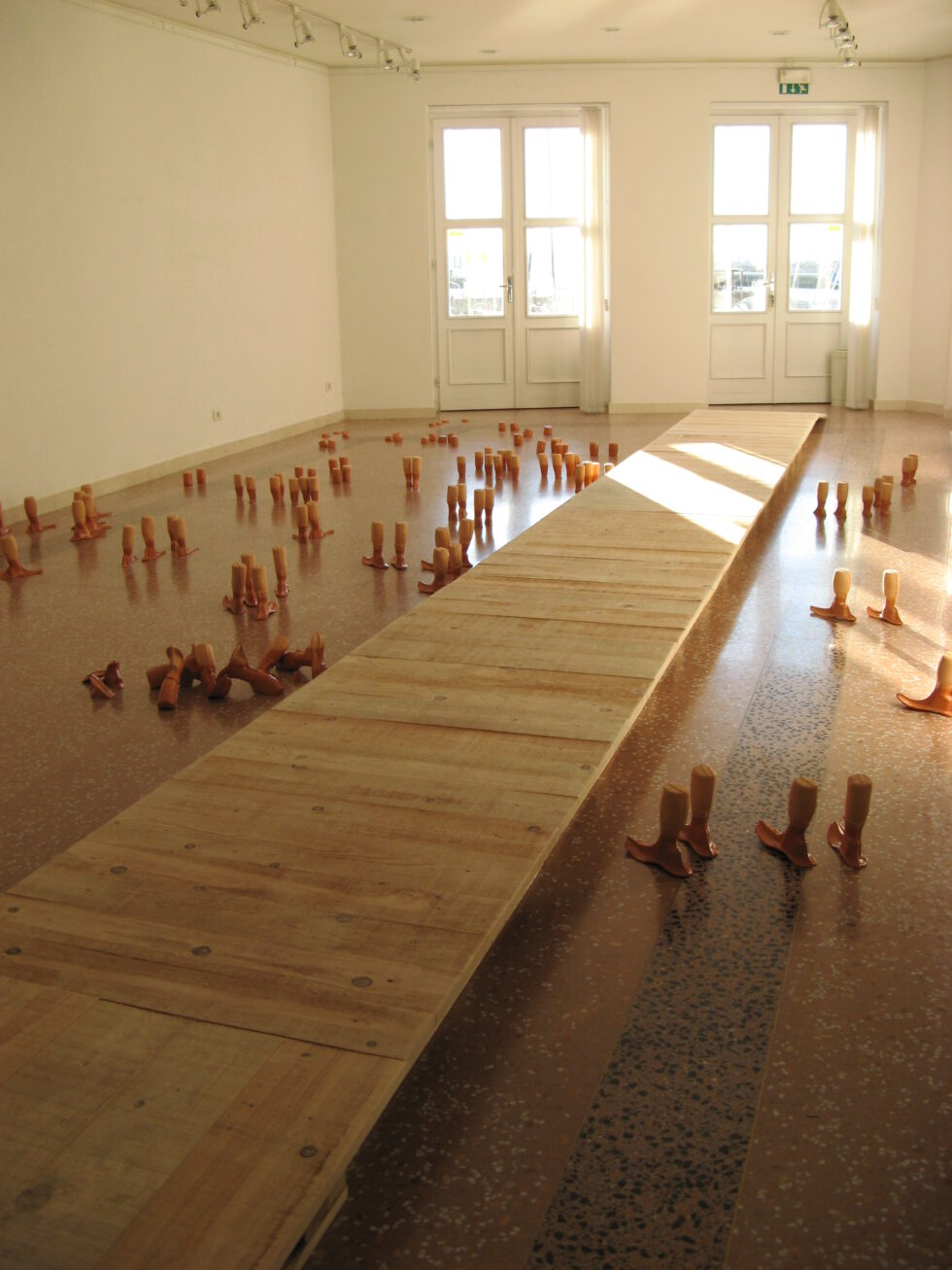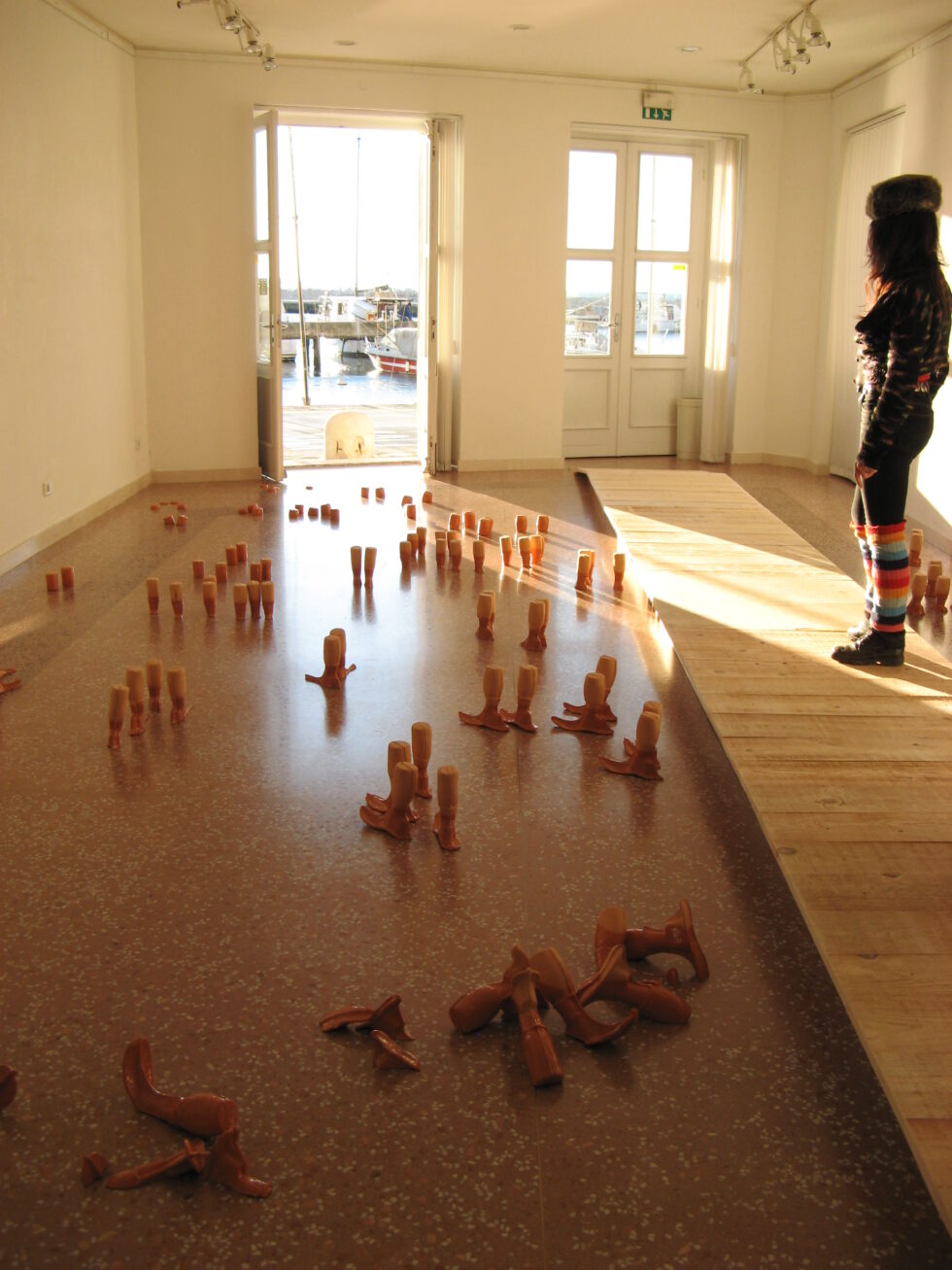 “This particular group of objects was created to make an illusion of a group of foot-like objects wading into shallow water into a soft sandy or clay-like material. In reality the ground was dry, hard, shiny stone. The objects were glazed with a shiny glaze to the same height to suggest a water environment. A smaller group of objects was shaped as if it had been washed up on shore while the majority of objects were directed toward the „deeper area“, which is also suggested by the shape and direction of the items.The wooden peer walking area was reserved for the people to walk on and observe the lower area. The gallery is placed at the seaside thus the objects were directed toward the sea which was actually visible through the glass entrance. The walking area was placed in between both entrances.