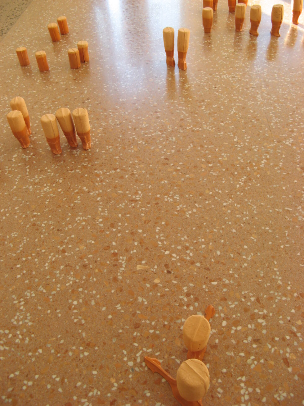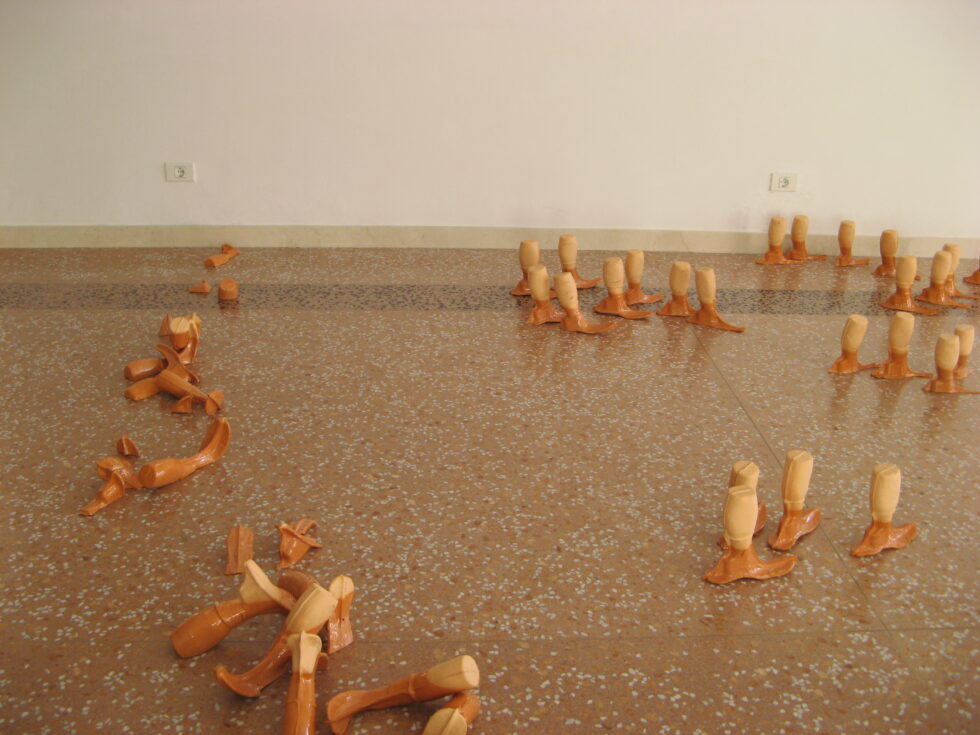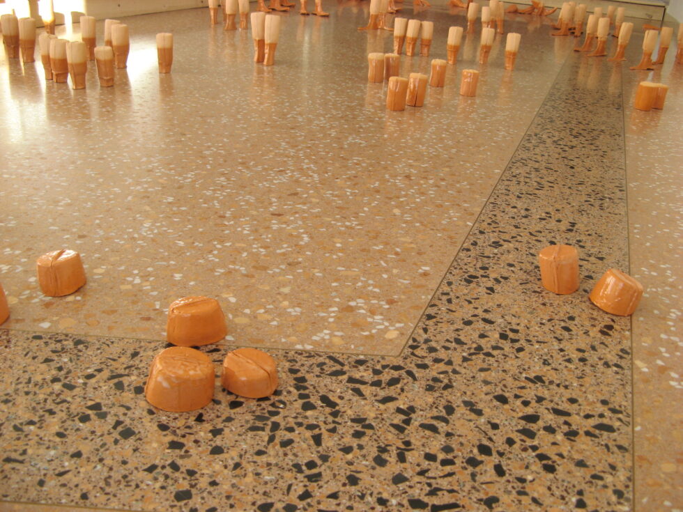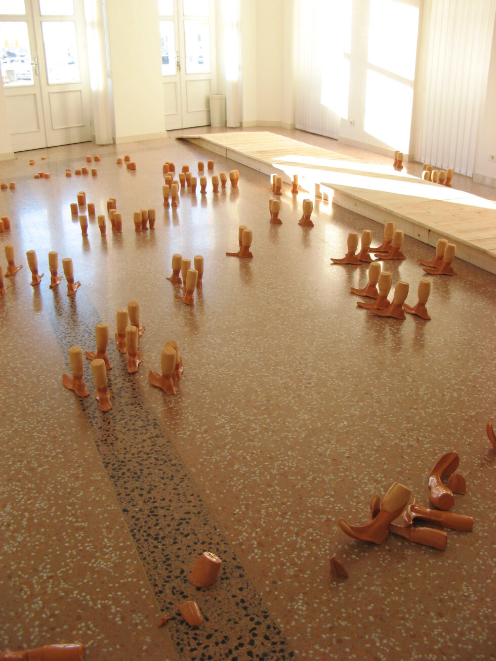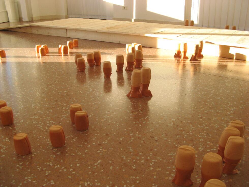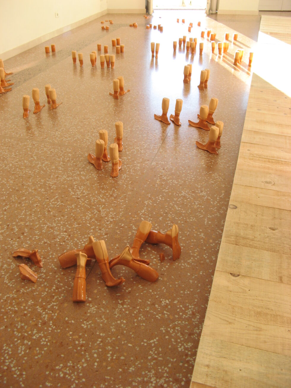 “This particular group of objects was created to make an illusion of a group of foot-like objects wading into shallow water into a soft sandy or clay-like material. In reality the ground was dry, hard, shiny stone. The objects were glazed with a shiny glaze to the same height to suggest a water environment. A smaller group of objects was shaped as if it had been washed up on shore while the majority of objects were directed toward the „deeper area“, which is also suggested by the shape and direction of the items.The wooden peer walking area was reserved for the people to walk on and observe the lower area. The gallery is placed at the seaside thus the objects were directed toward the sea which was actually visible through the glass entrance. The walking area was placed in between both entrances.