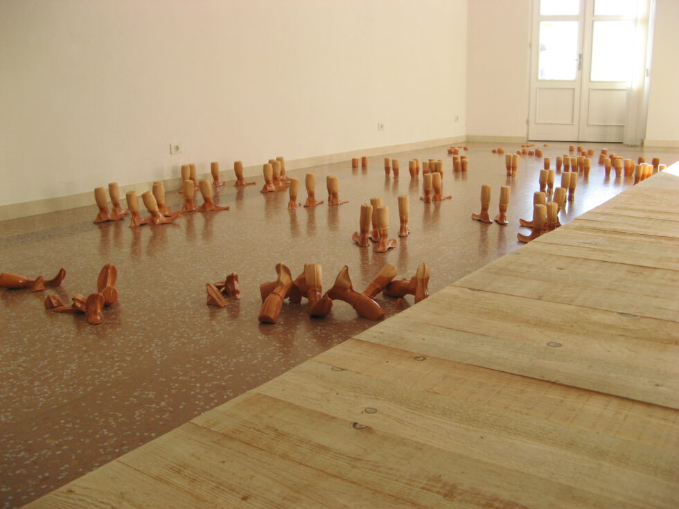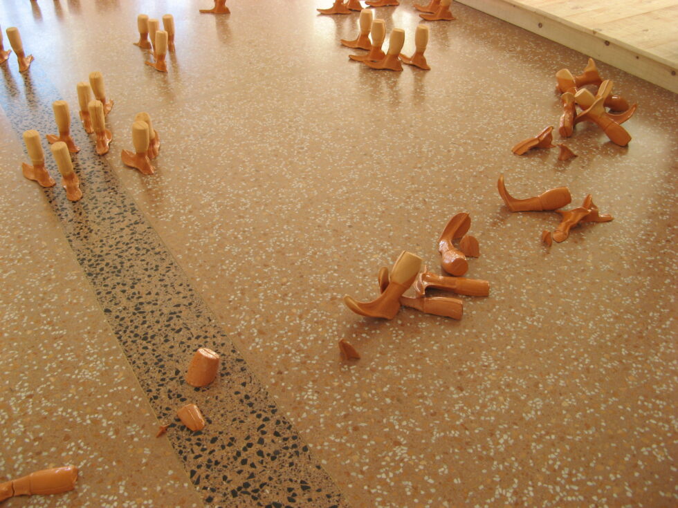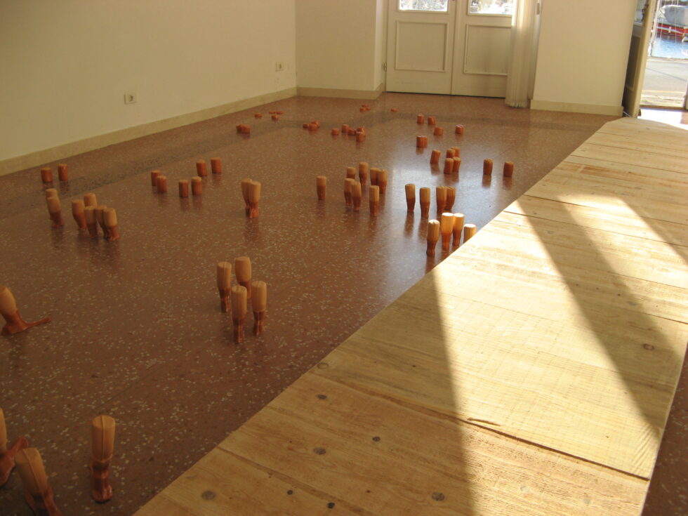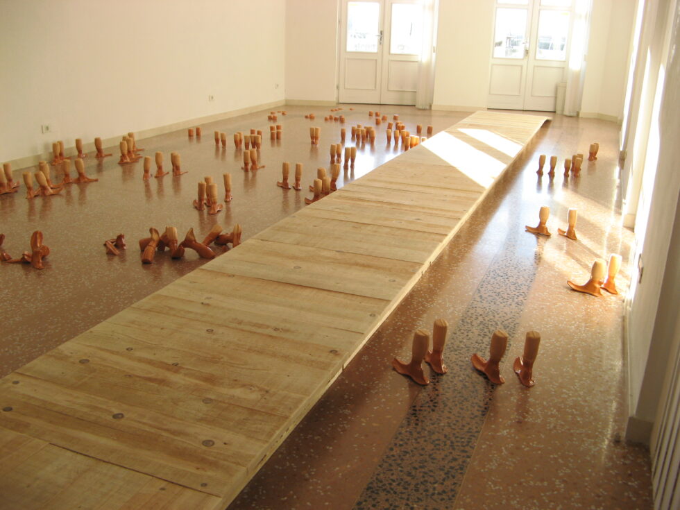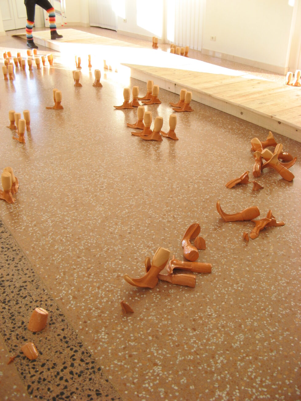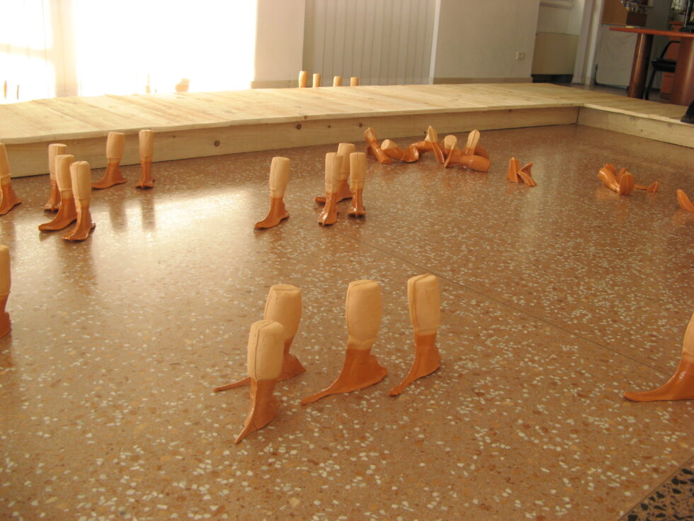 “This particular group of objects was created to make an illusion of a group of foot-like objects wading into shallow water into a soft sandy or clay-like material. In reality the ground was dry, hard, shiny stone. The objects were glazed with a shiny glaze to the same height to suggest a water environment. A smaller group of objects was shaped as if it had been washed up on shore while the majority of objects were directed toward the „deeper area“, which is also suggested by the shape and direction of the items.The wooden peer walking area was reserved for the people to walk on and observe the lower area. The gallery is placed at the seaside thus the objects were directed toward the sea which was actually visible through the glass entrance. The walking area was placed in between both entrances.
