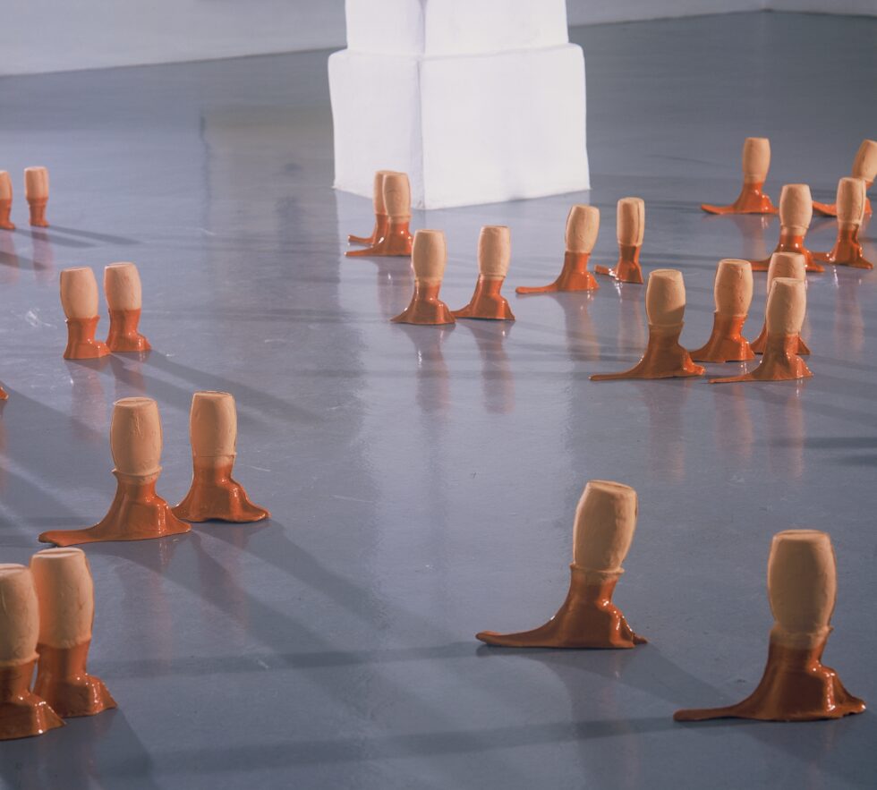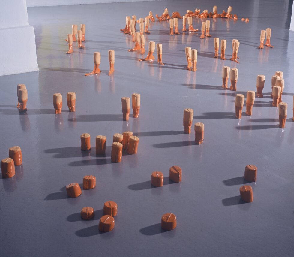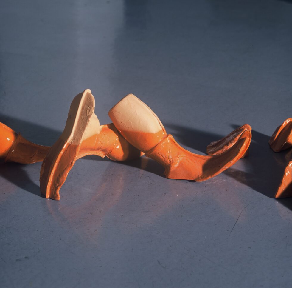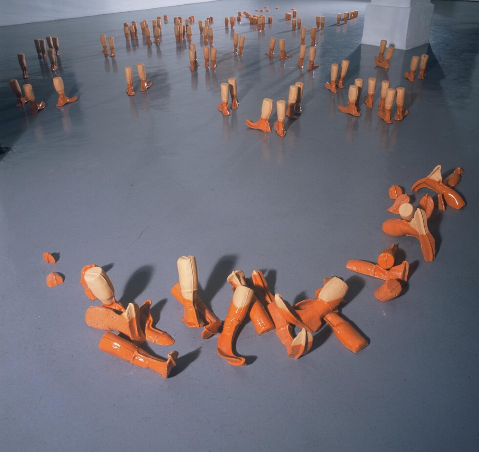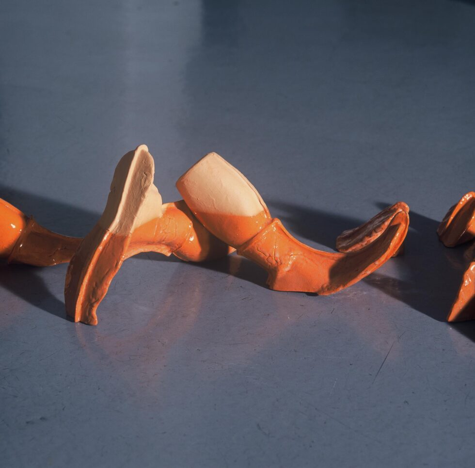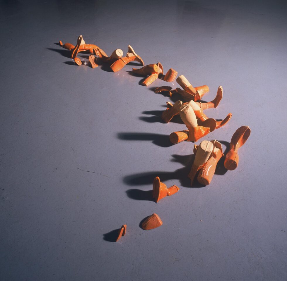 “This particular group of objects was created to make an illusion of a group of foot-like objects wading into shallow water into a soft sandy or clay-like material. In reality the ground was dry, hard, shiny stone. The objects were glazed with a shiny glaze to the same height to suggest a water environment. A smaller group of objects was shaped as if it had been washed up on shore while the majority of objects were directed toward the „deeper area“, which is also suggested by the shape and direction of the items.The wooden peer walking area was reserved for the people to walk on and observe the lower area. The gallery is placed at the seaside thus the objects were directed toward the sea which was actually visible through the glass entrance. The walking area was placed in between both entrances.
